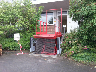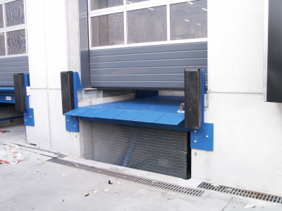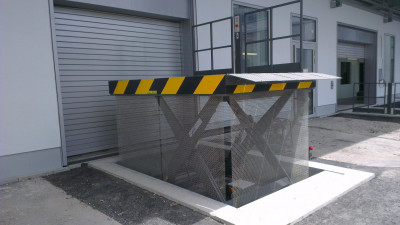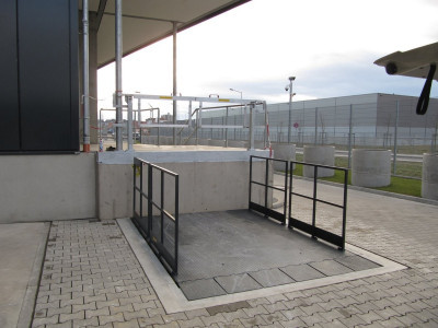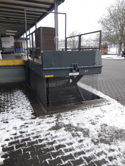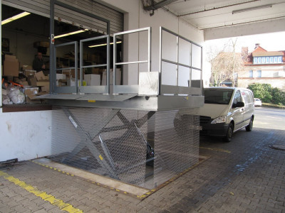 |   Verlade-Hebebühne zum Be- und Entladen von Gütern, ausgestattet mit Schutzgeländer und elektromechanisch verriegelten Schranken gegen Absturzgefahr |