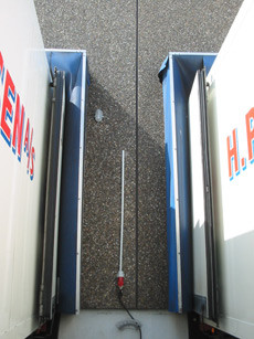 |   Die Wetterschutzanlage besteht aus je einem verzinkten Wand- und Frontrahmen und einem dazwischen liegenden Spreizsystem, welches sich bei einer Bautiefe von 600 mm bis auf ca. 200 mm zusammenschieben lässt. Durch dieses System werden Beschädigungen am Wetterschutz und am LKW durch ungenau andockende Lastwagen vermieden. Im Frontrahmen sind die Seiten- und Kopfschürzen eingespannt. Serienmäßig stehen verschiedene Materialien in unterschiedlichen Materialstärken für die Seiten und Kopfschürzen zur Auswahl. |